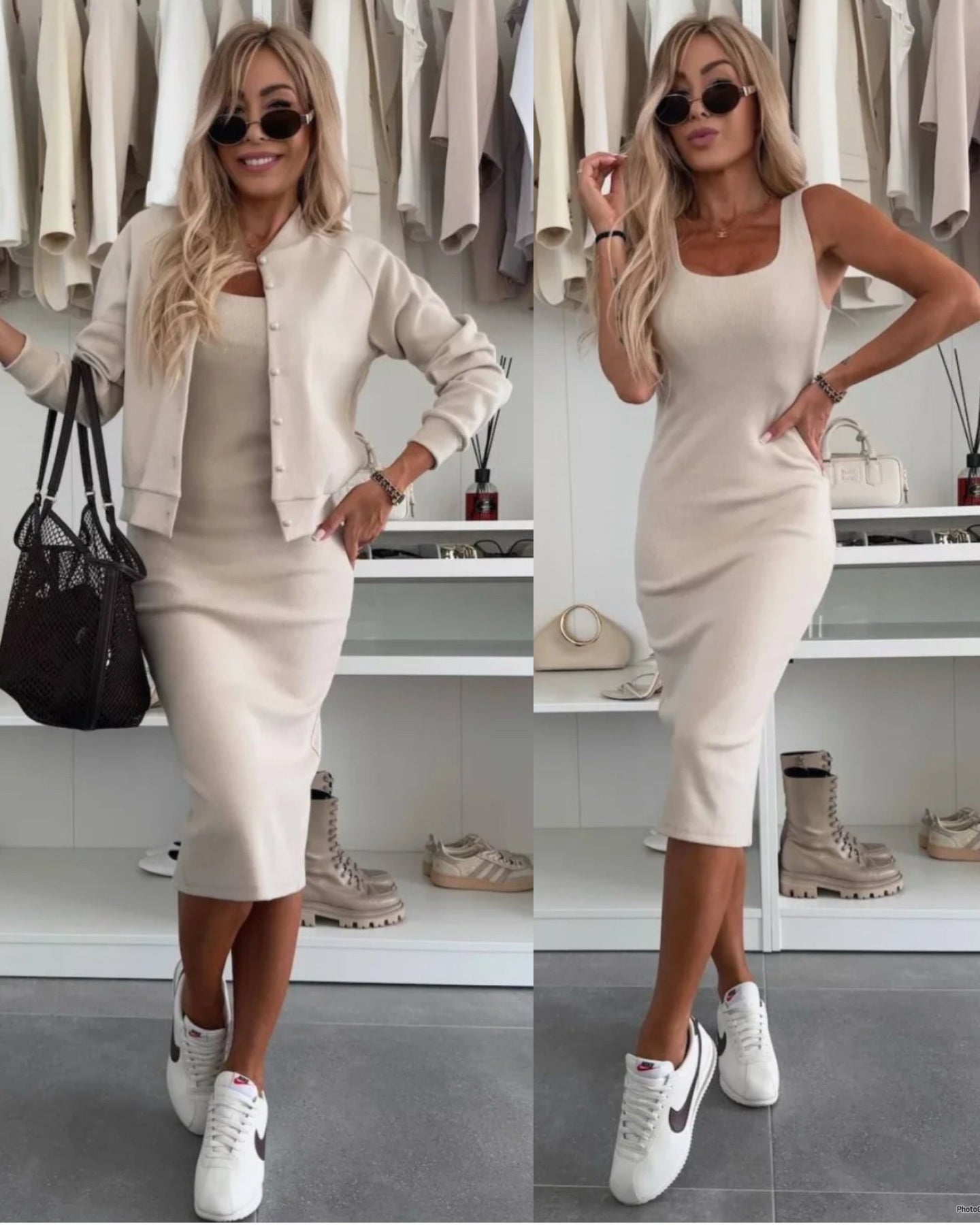 ✔️ 2 in 1 perfetto – Abito midi + giacca bomber per un look completo e sempre pronto.